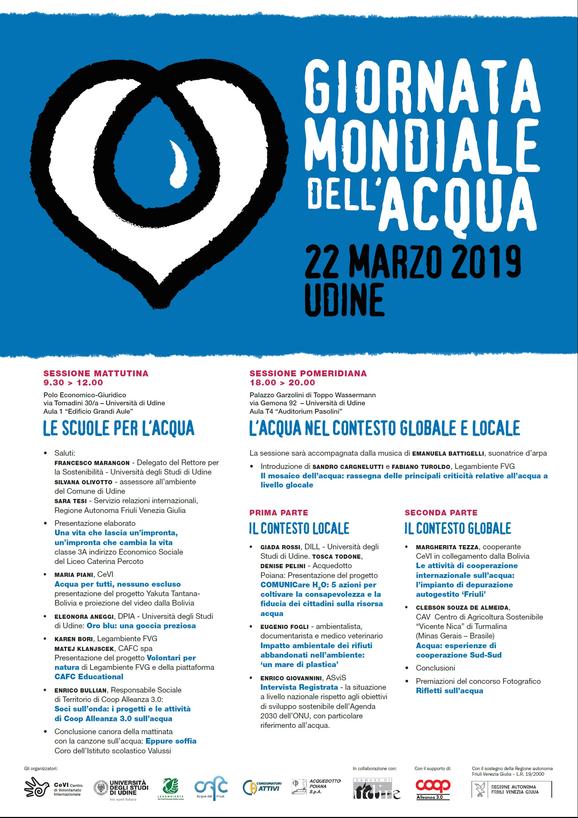 Il 22 marzo 2019 si terrà a Udine una giornata dedicata alla sensibilizzazione della risorsa idrica a cui parteciperà anche l'Acquedotto Poiana SpA assieme agli altri partners del progetto COMUNICare H2O.  Il tema di quest'anno è "Non lasciare nessuno indietro", pertanto l'argomento verrà affrontato sia a livello locale che globale. Per approfondimenti pubblichiamo la locandina dell'evento.